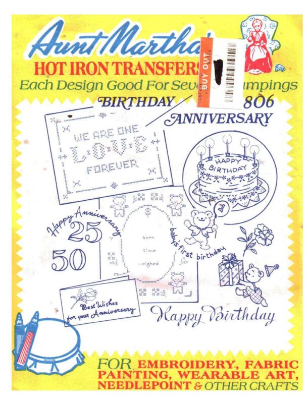 Aunt Martha’s Hot Iron Transfers 3806 Happy Birthday or Anniversary Size: One Uncut Sewing Pattern