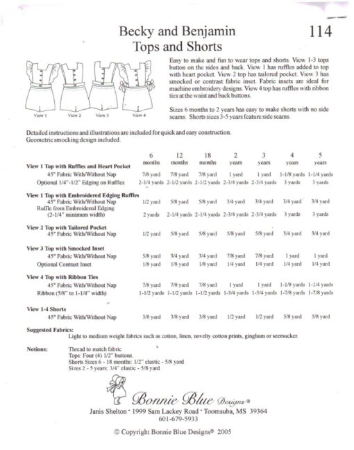 Bonnie Blue Designs 114 Becky & Menjamin Tops & Shorts Size: 6-12-18Mo and 2-3-4-5 Uncut Sewing Pattern