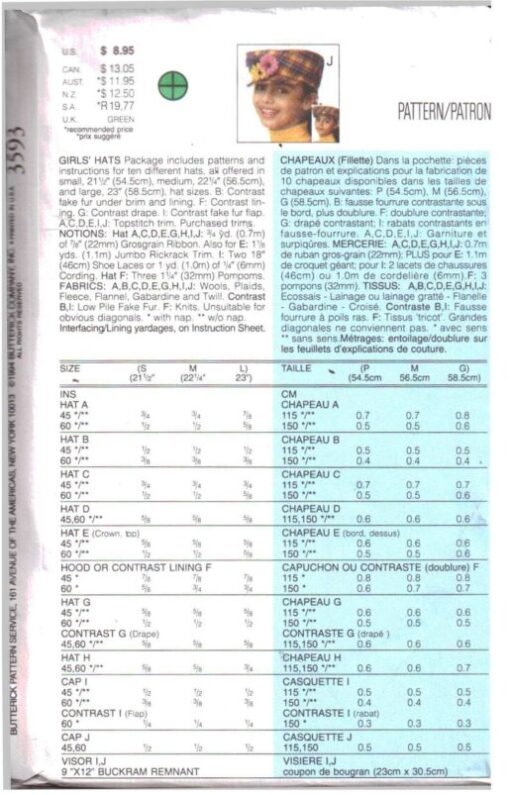 Butterick 3593 Girls’ Hats Size: S-M-L Uncut Sewing Pattern