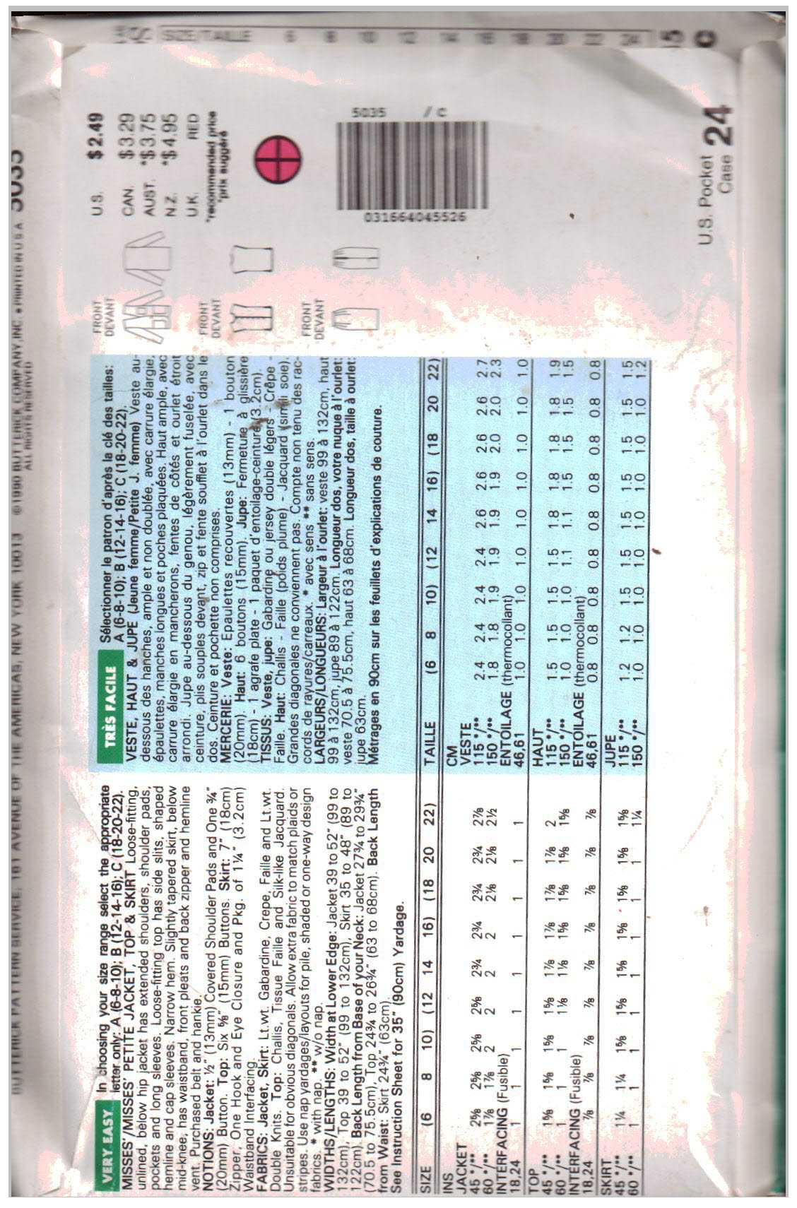 Butterick 5035 Jacket, Top, Skirt Size: C 18-20-22 Used Sewing Pattern