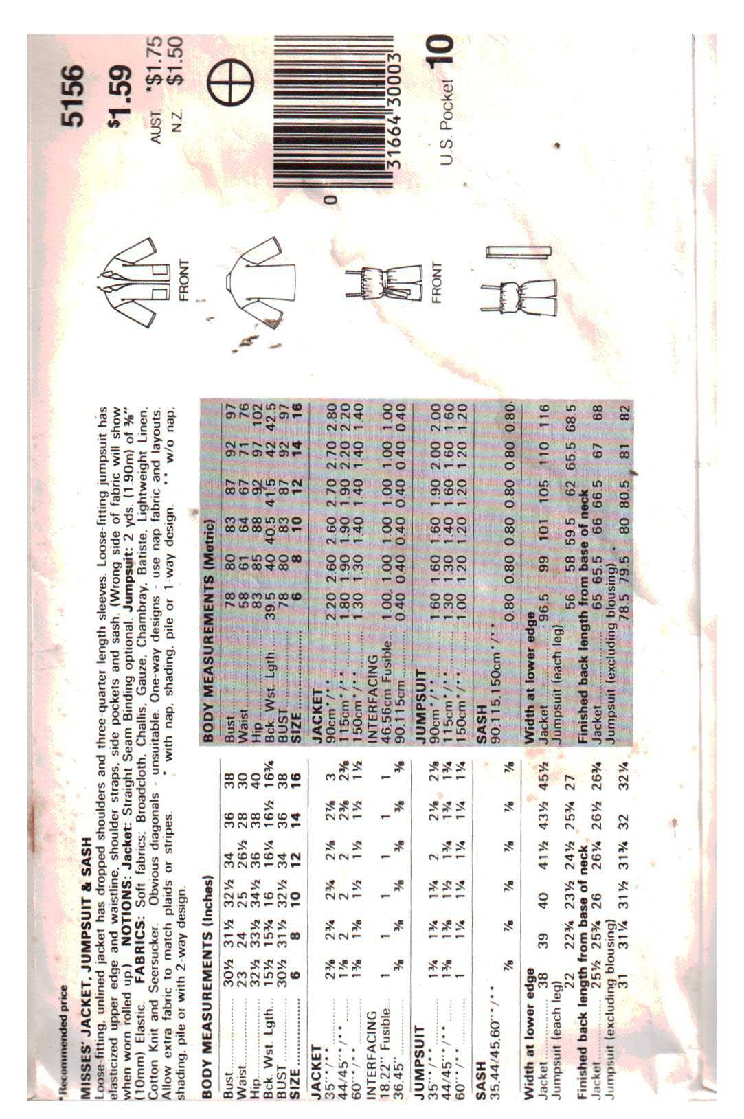 Butterick 5156 Jacket, Jumpsuit Size: A 6-10 Used Sewing Pattern