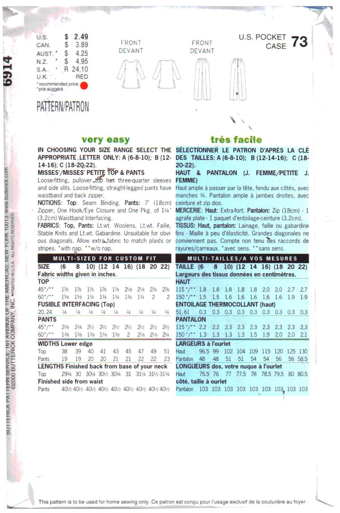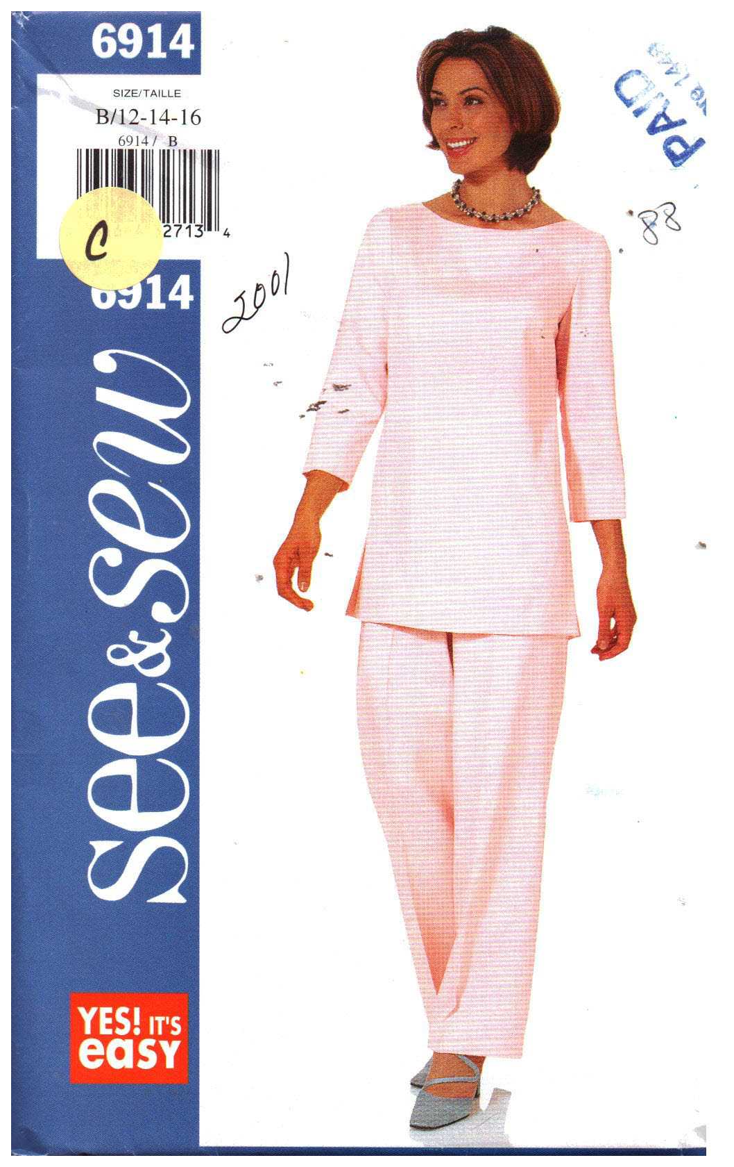 Butterick 6914 Top, Pants Size: B 12-16 Used Sewing Pattern