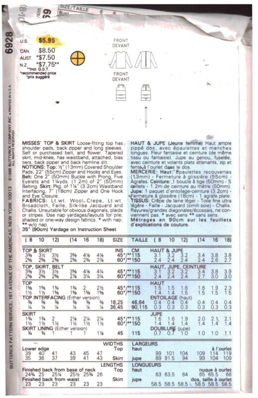 Butterick 6928 Top, Skirt Size: 8-10-12 Uncut Sewing Pattern