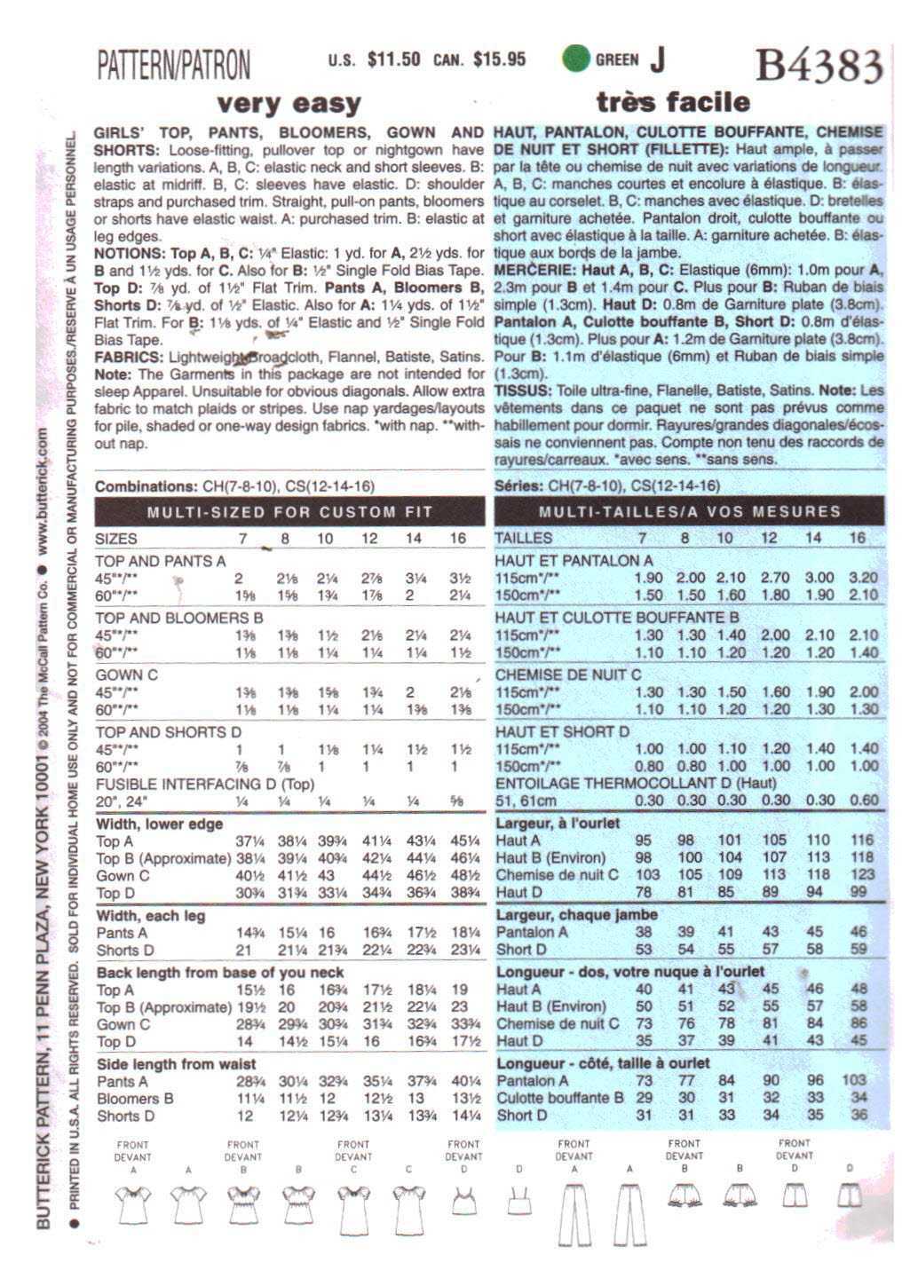 Butterick B4383 Girl’s Nightgown, Pajamas Size: CH 7-8-10 Uncut Sewing Pattern