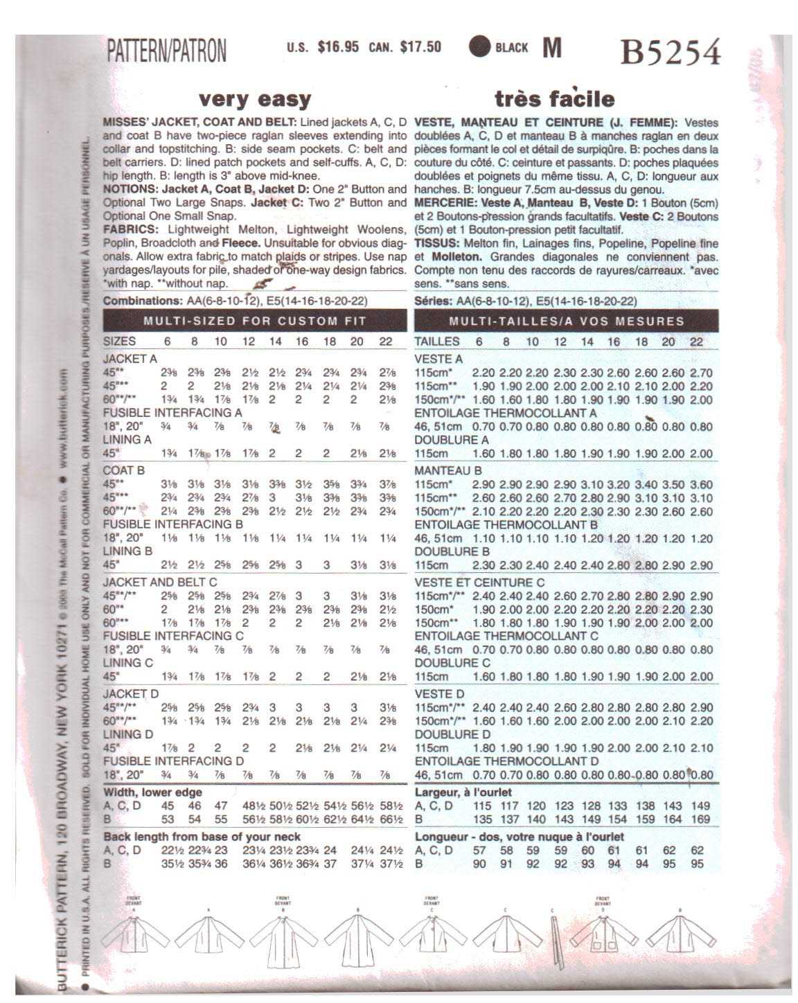 Butterick B5254 Coat, Jacket Size: E5 14-16-18-20-22 Uncut Sewing Pattern
