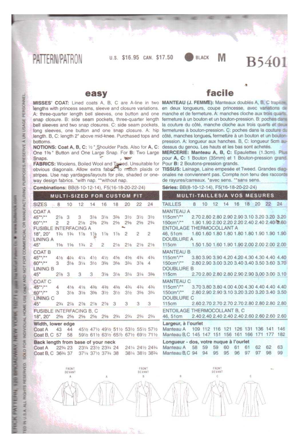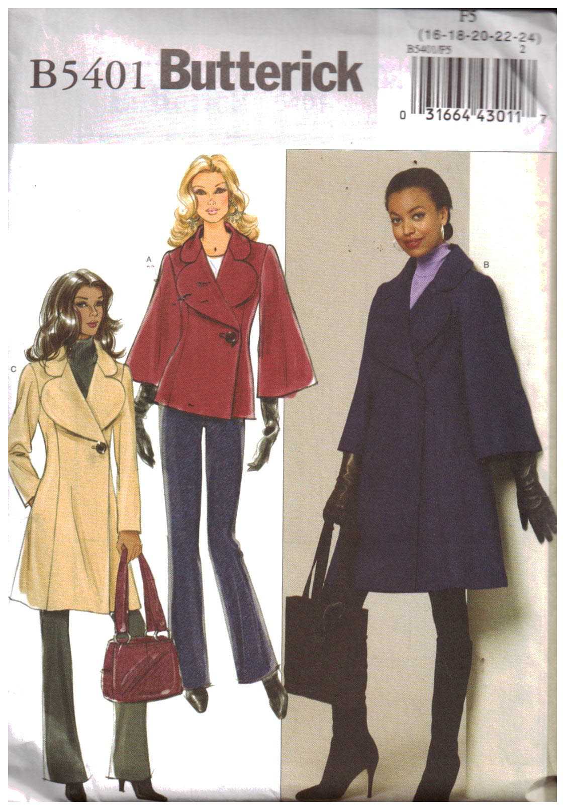 Butterick B5401 Coat Size: F5 16-18-20-22-24 Uncut Sewing Pattern