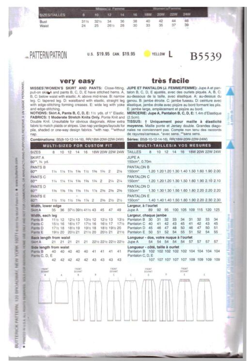 Butterick B5539 Skirt, Pants Size: B5 8-10-12-14-16 Uncut Sewing Pattern