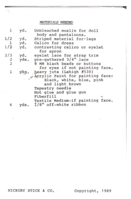 Hickory Stick & Co H127 Beth Doll Size: One Uncut Sewing Pattern