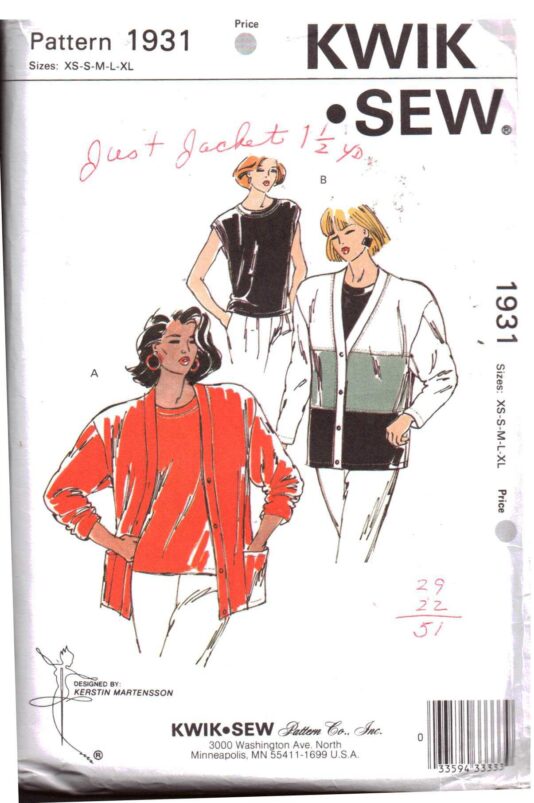 Kwik Sew 1931 Top, Cardigan Size: XS-XL Uncut Sewing Pattern