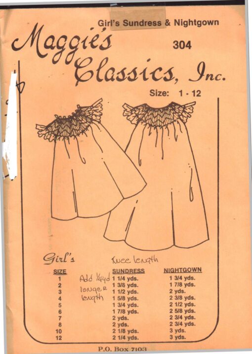 Maggie’s Classics 304 Girl’s Sundress & Nightgown Size: 1-12 Uncut Sewing Pattern