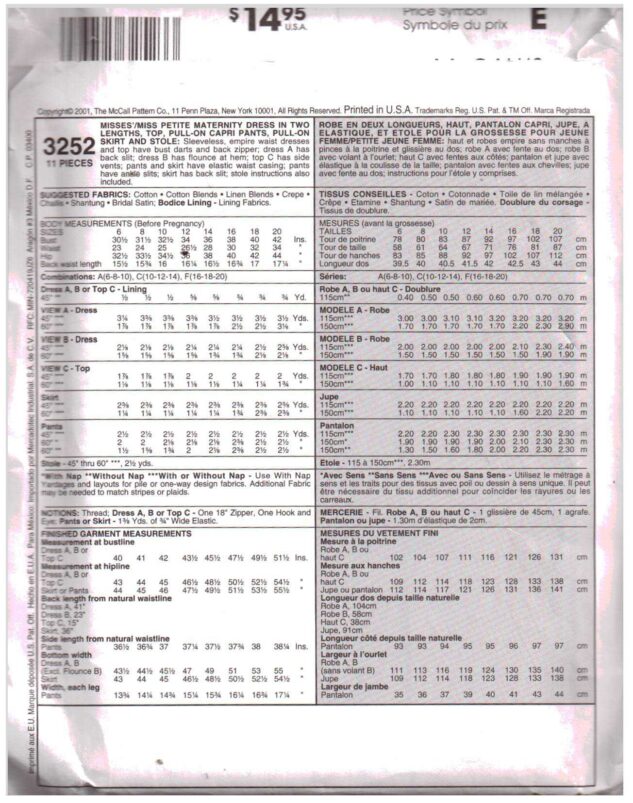 McCall’s 3252 Maternity Dress in two lengths, Top, Pull-on Capri Pants, Pull-on Skirt, Stole Size: F 16-18-20 Uncut Sewing Pattern