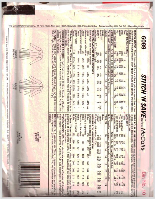 McCall’s 6089 Dress Size: A 10-12-14-16 Uncut Sewing Pattern