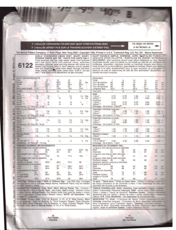 McCall’s 6122 Girl’s Vest, Shirt, Skirt, Stirrup Pants, Tie Size: 12 or 14 Used Sewing Pattern