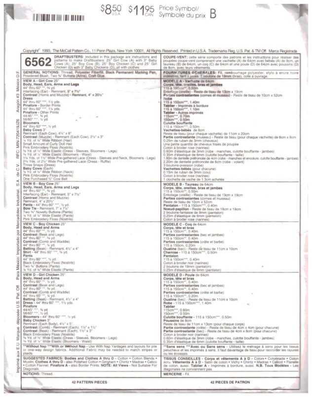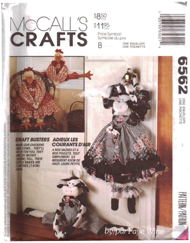 McCall’s 6562 Draftbusters – Girl Cow, Boy Cow, Boy Chicken, Girl Chicken Size: 25″ Uncut Sewing Pattern