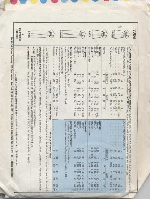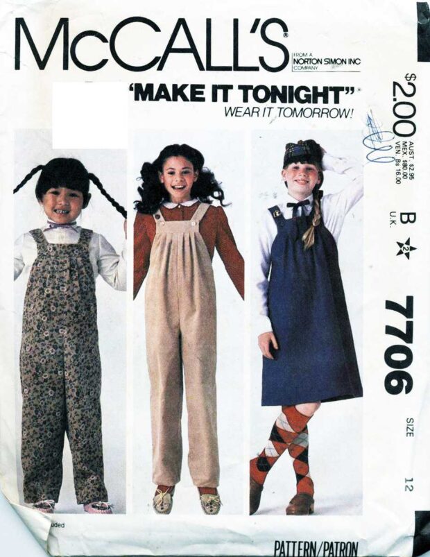 McCall’s 7706 Girl’s Jumper, Jumpsuit Size: 12 Uncut Sewing Pattern