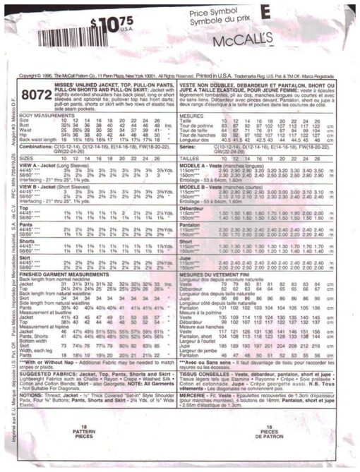 McCall’s 8072 Jacket, Top, Pull-on Pants, Shorts, Skirt Size: FW 18-20-22 Uncut Sewing Pattern