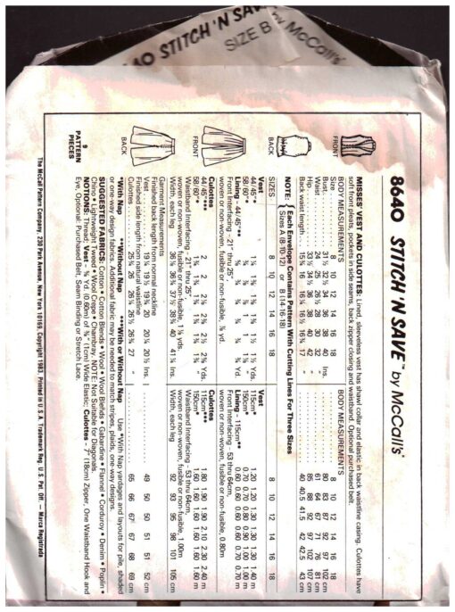 McCall’s 8640 Vest, Culottes Size: B 14-16-18 or A 8-10-12 Uncut Sewing Pattern