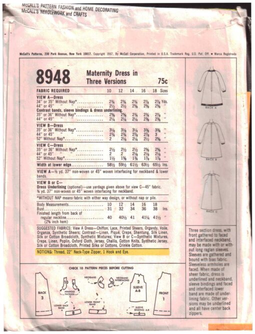 McCall’s 8948 Maternity Dress in 3 Versions Size: 12 Used Sewing Pattern