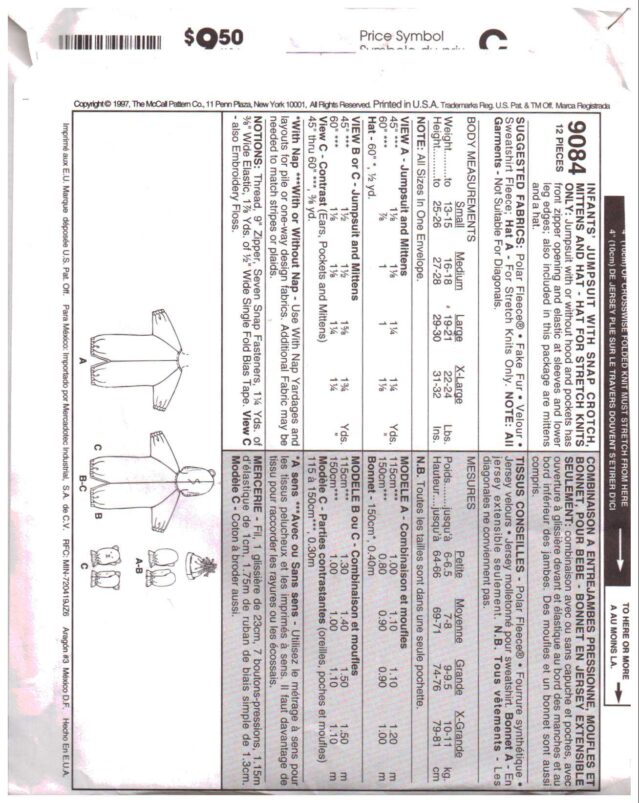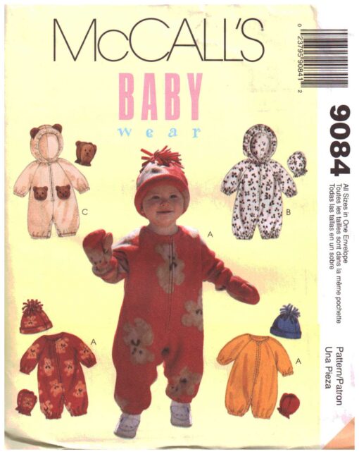 McCall’s 9084 Infants Jumpsuit with snap crotch, Mittens, Hat for stretch knit Size: S-M-L-XL Uncut Sewing Pattern