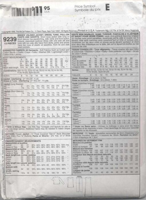 McCall’s 9239 Jacket, Dress, Tunic, Pull-On Pants & Shorts Size: C 10-14 Uncut Sewing Pattern