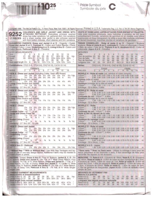 McCall’s 9252 Girls Jacket, Dress with attached Petticoat Size: CD 2-3-4 Uncut Sewing Pattern