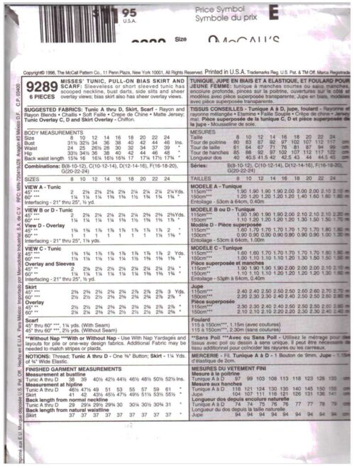McCall’s 9289 Tunic, Pull-on Bias Skirt, Scarf Size: C 10-12-14 or G 20-22-24 Uncut