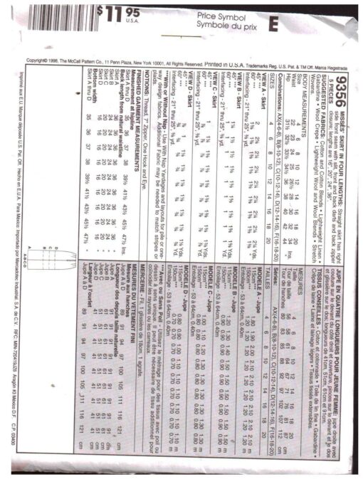 McCall’s 9356 Skirt in four lengths Size: C 10-12-14 Uncut Sewing Pattern