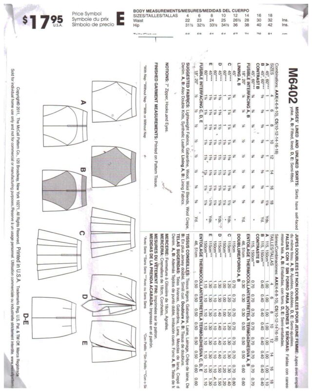 McCall’s M6402 Lined & Unlined Skirts Size: AAX 4-6-8-10 Uncut Sewing Pattern