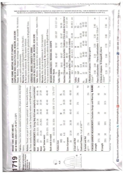 Simplicity 1719 Coat, Jacket, Hat Size: A XXS-XL Uncut Sewing Pattern