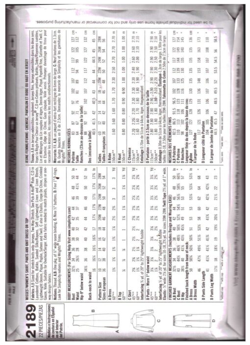 Simplicity 2189 Shirt, Pants, Dress, Top Size: BB 20W-28W Uncut Sewing Pattern