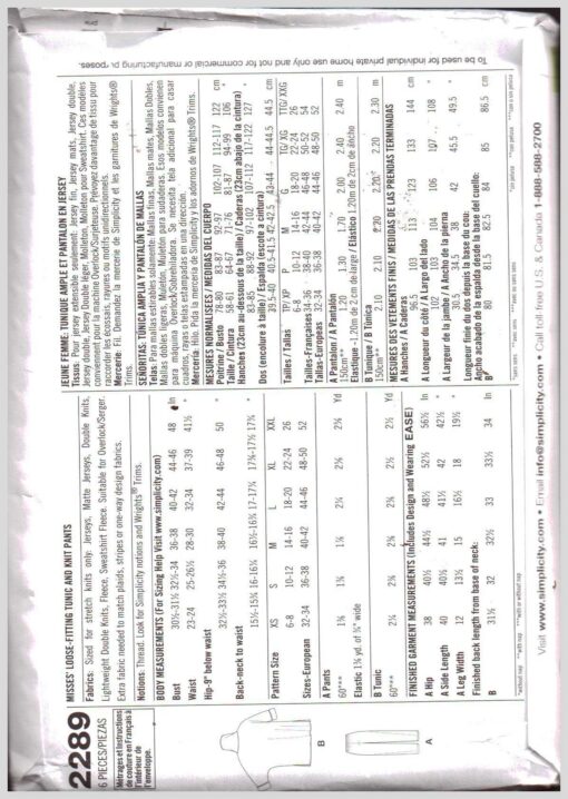 Simplicity 2289 Tunic, Pants by Patty Reed Size: A XS-XXL Uncut Sewing Pattern