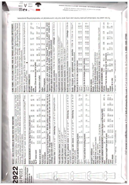 Simplicity 2922 Dress, Tunic with yoke variations Size: D5 4-6-8-10-12 Uncut Sewing Pattern