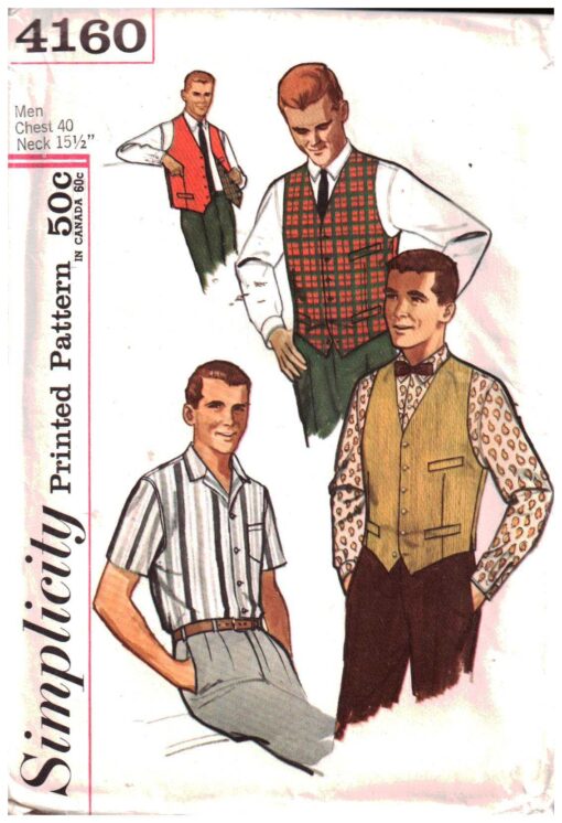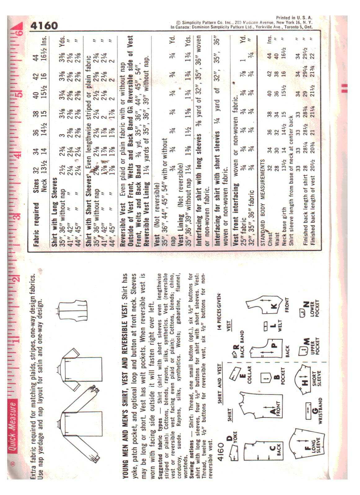 Simplicity 4160 Men’s Shirt, Vest, Reversible Vest Size: Chest 40 Neck 15.5 Used Sewing Pattern