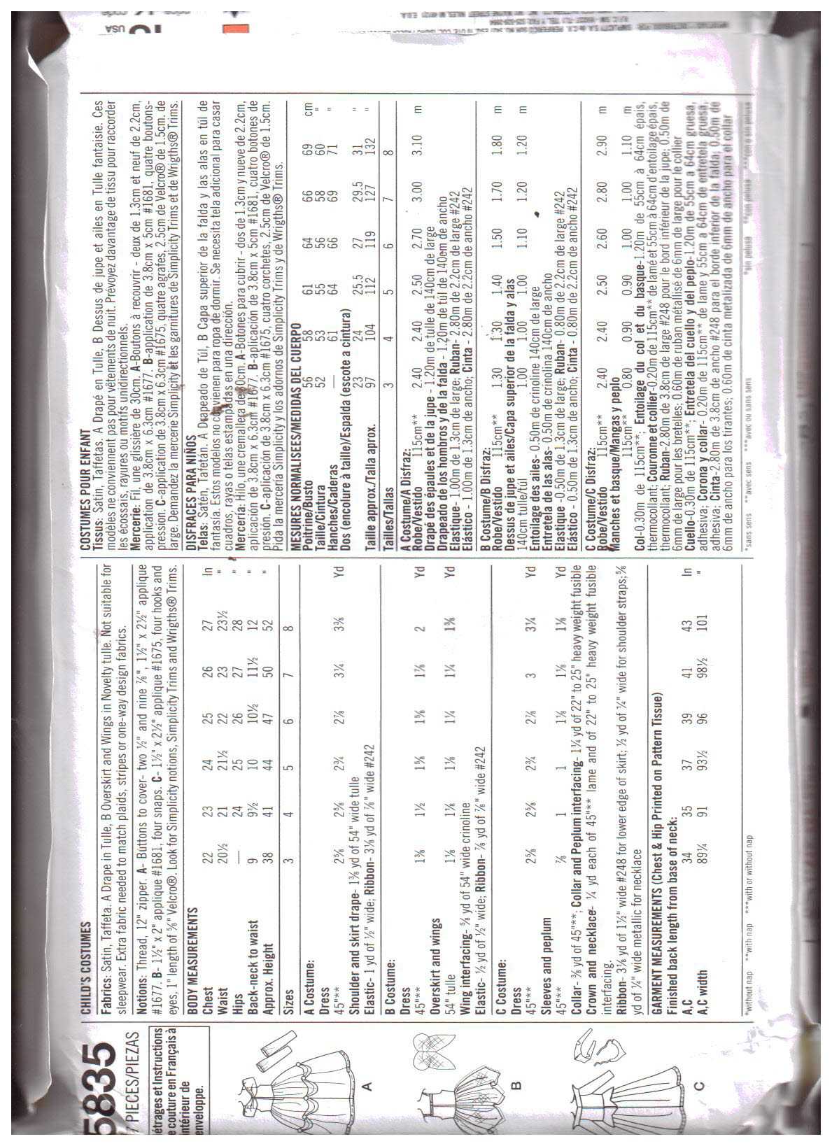 Simplicity 5835 Girl’s Costume – Princess, Fariy Size: A 3-8 Used Sewing Pattern