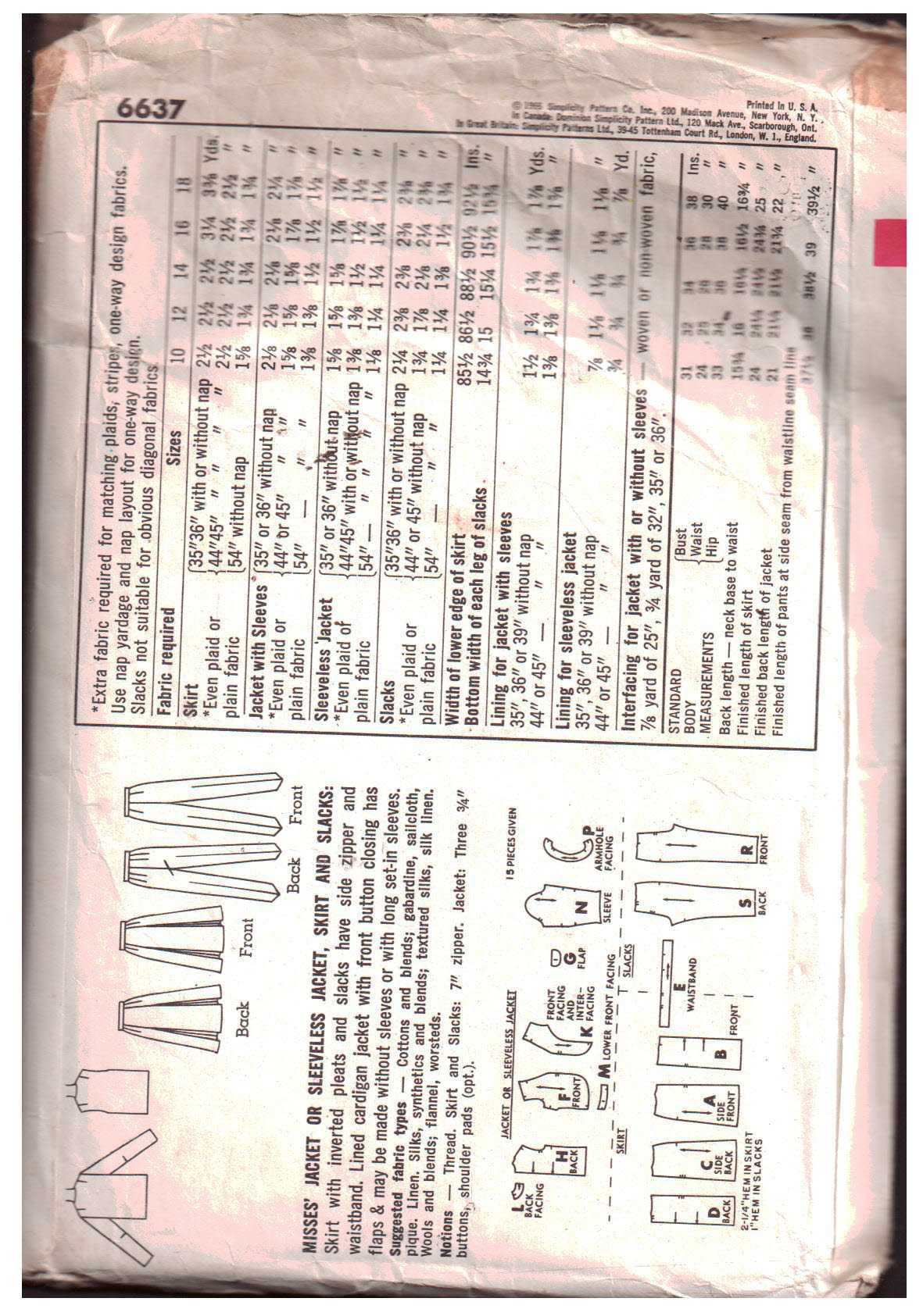 Simplicity 6637 Jacket, Vest, Skirt, Pants Size: 10 Bust 31 Used Sewing Pattern