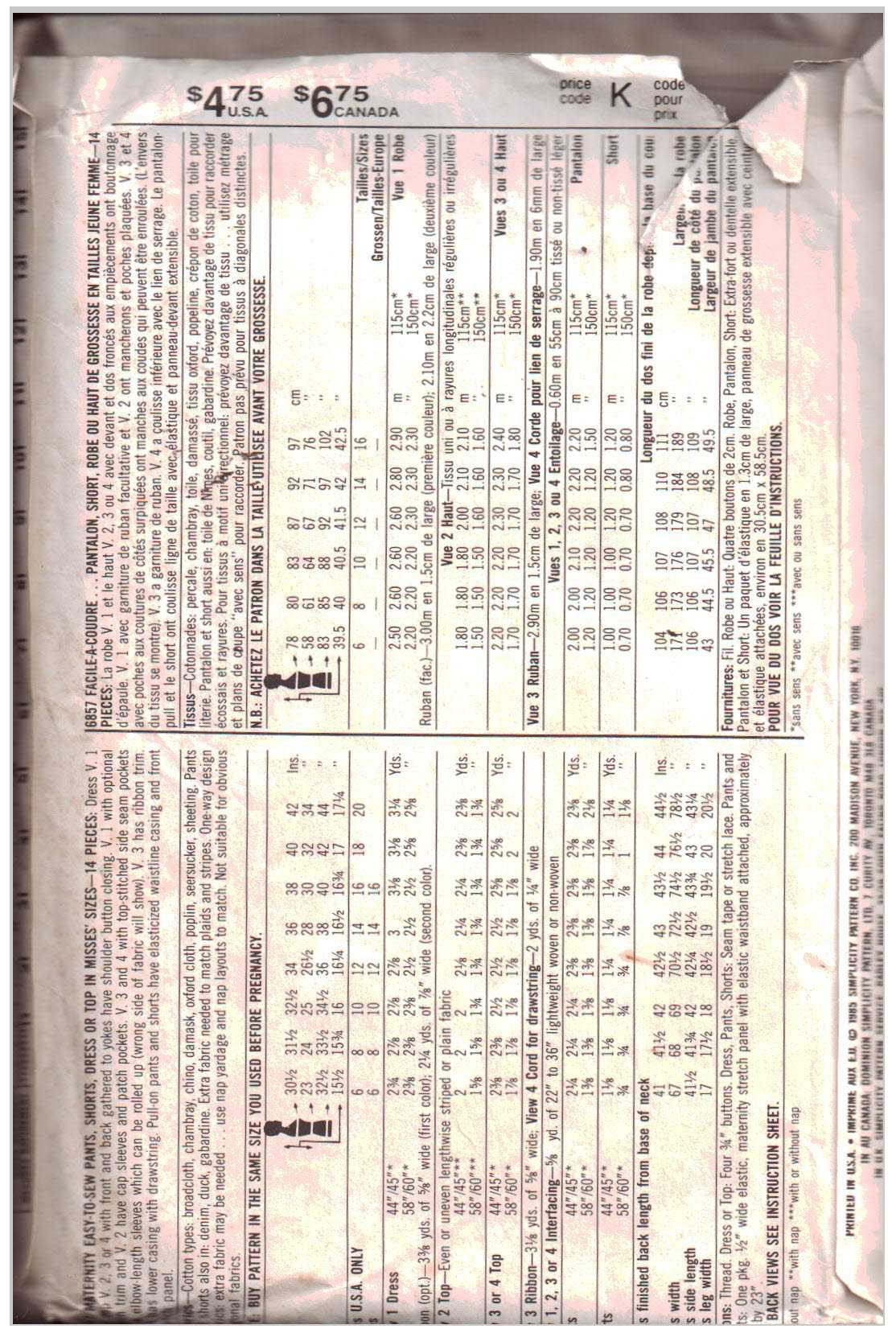 Simplicity 6857 Maternity Pants, Shorts, Dress, Top Size: 10 Used Sewing Pattern