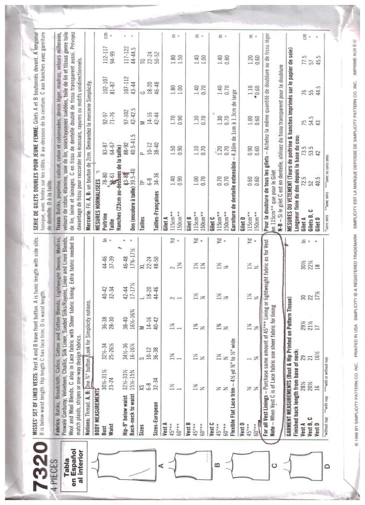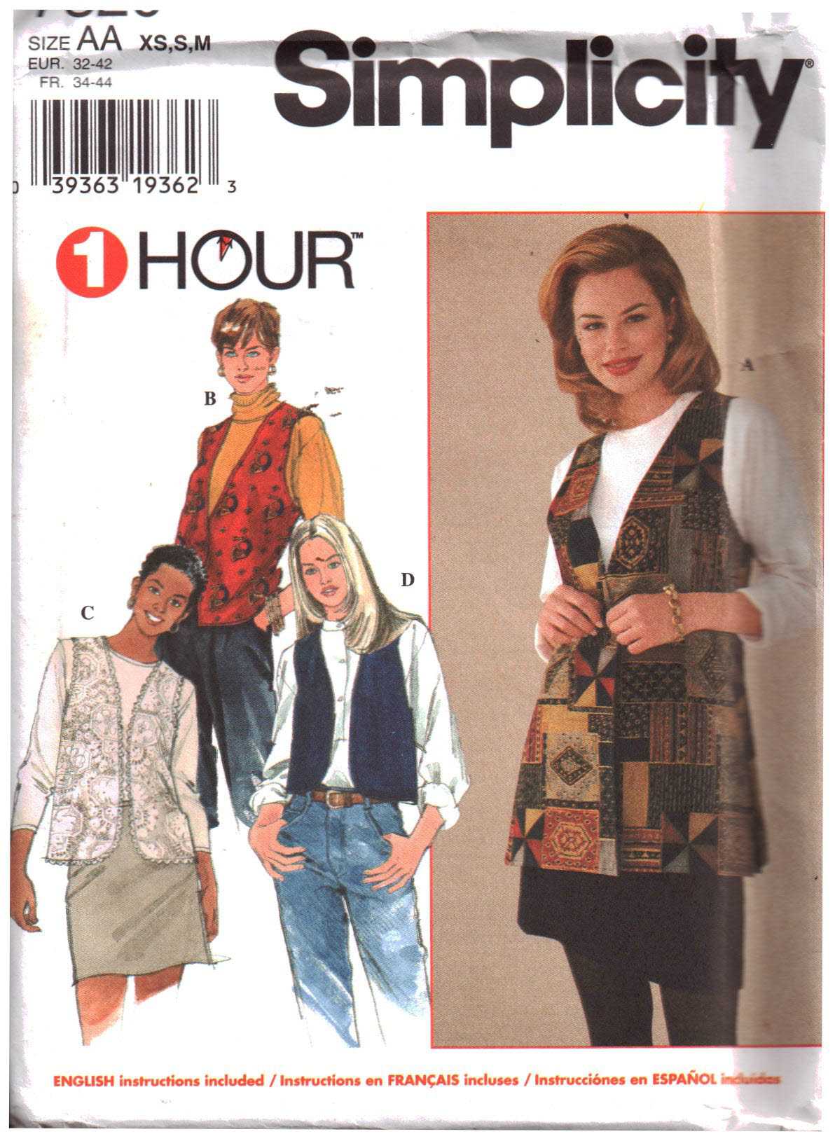 Simplicity 7320 Vest Size: AA XS-S-M Uncut Sewing Pattern