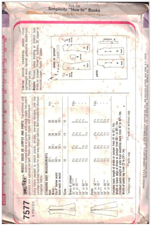 Simplicity 7577 Dress, Jumper, Pants Size: 12 Used Sewing Pattern