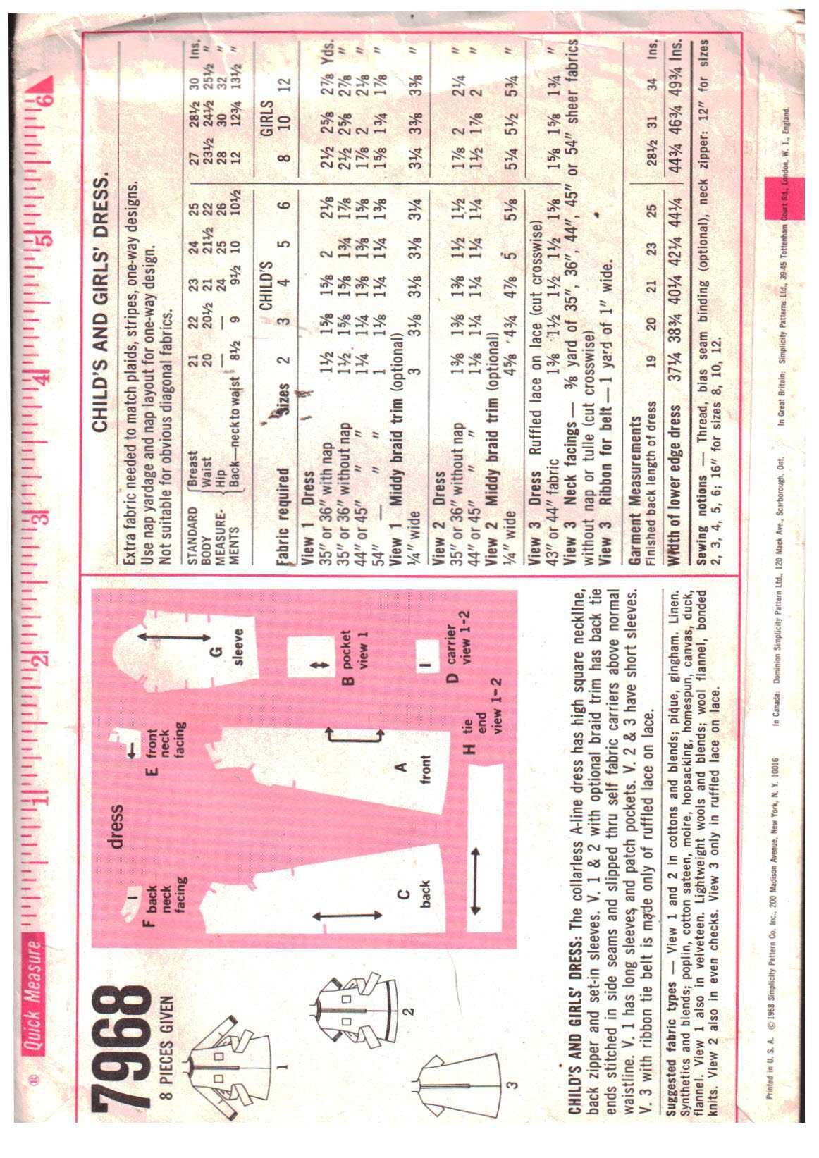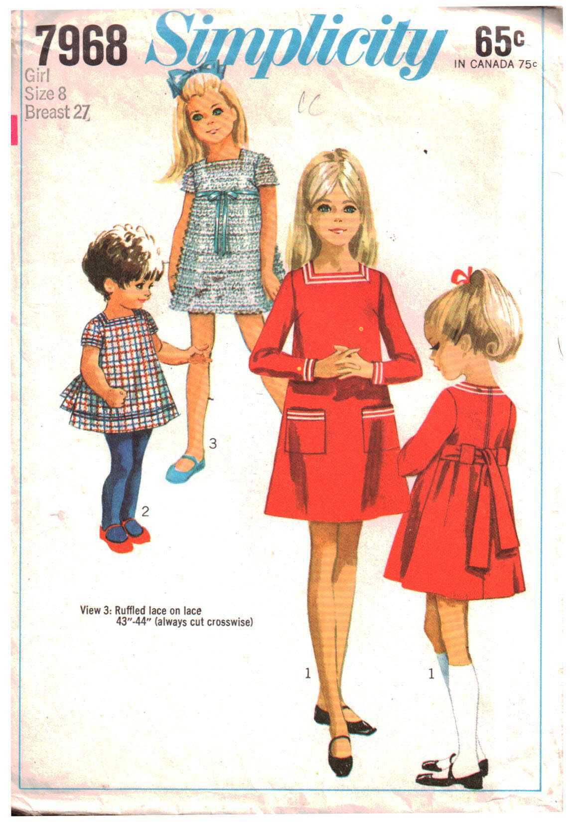 Simplicity 7968 Girl’s Dress Size: 8 Breast 27 Used Sewing Pattern