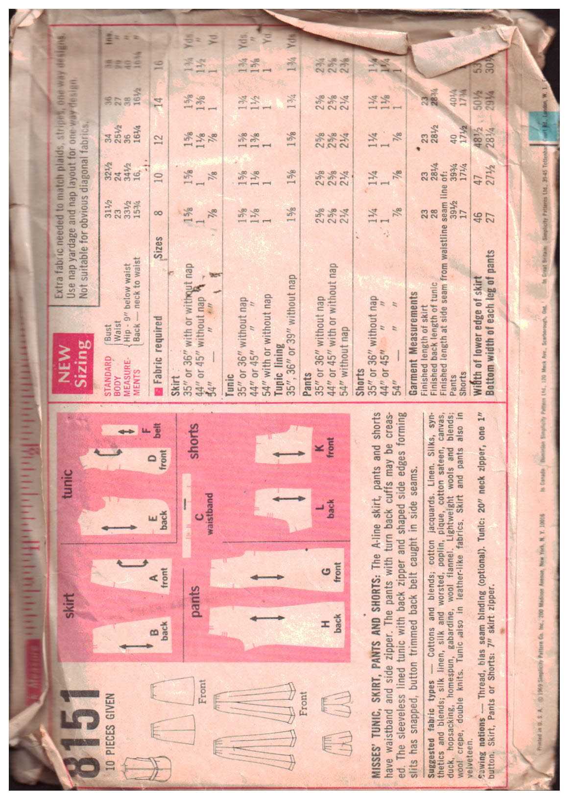 Simplicity 8151 Tunic, Skirt, Pants, Shorts Size: 12 Bust 34 Used Sewing Pattern