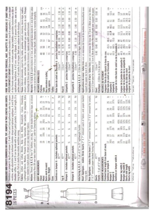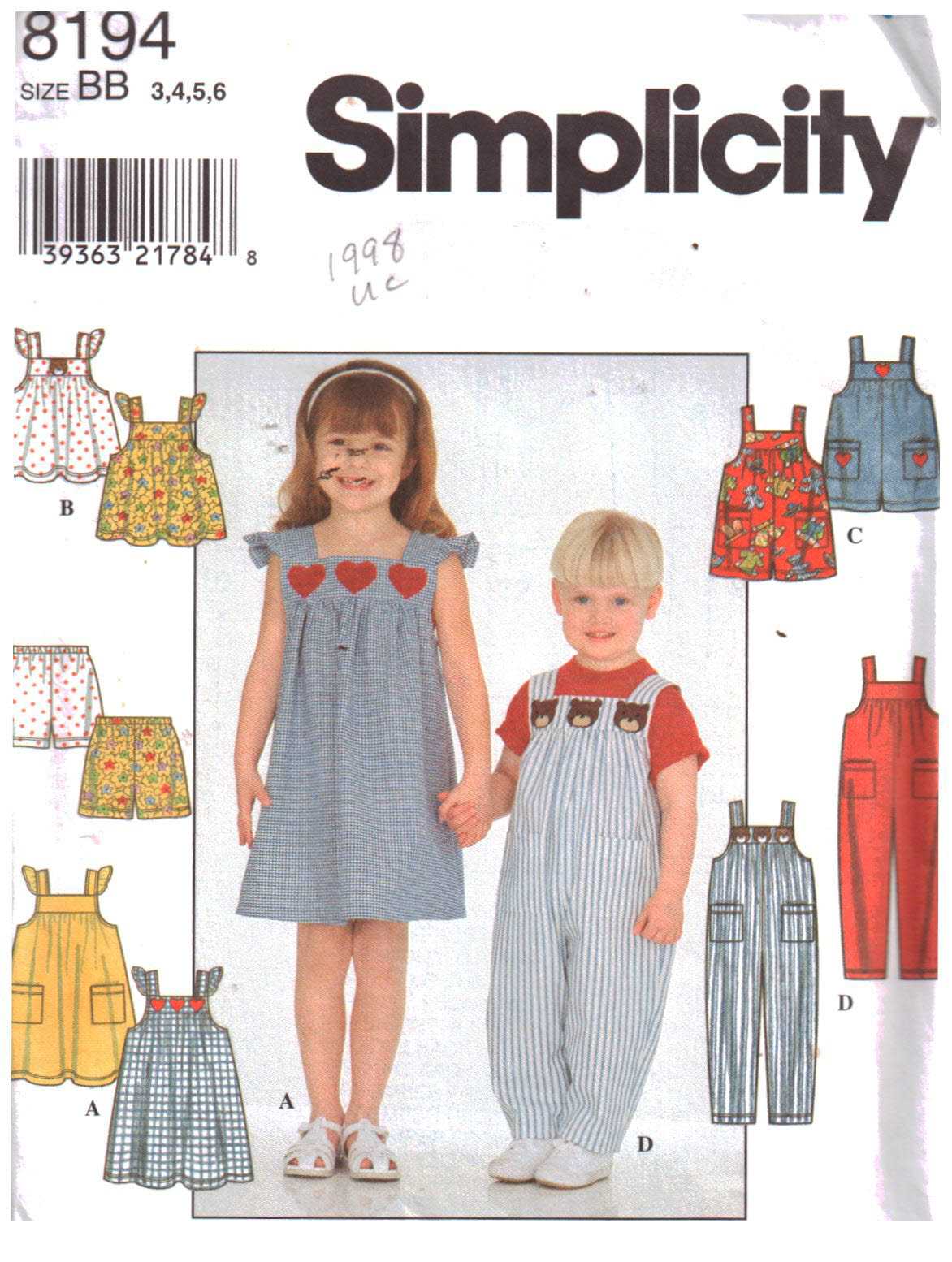 Simplicity 8194 Toddlers Sundress, Jumper, Top, Romper, Shorts Size: BB 3-6 Used Sewing Pattern