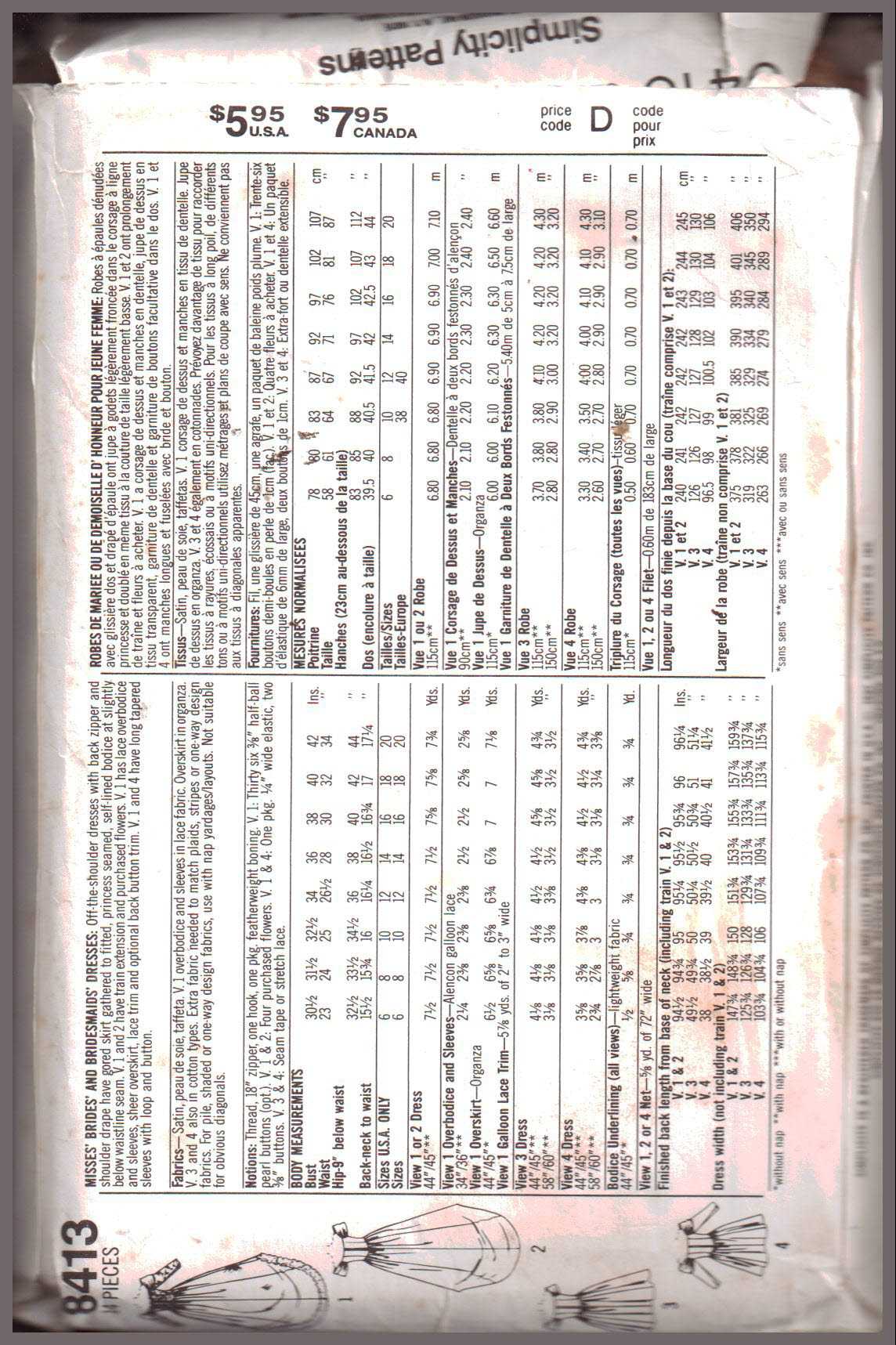 Simplicity 8413 Bride’s Dress, Bridesmaid Size: 8 Used Sewing Pattern