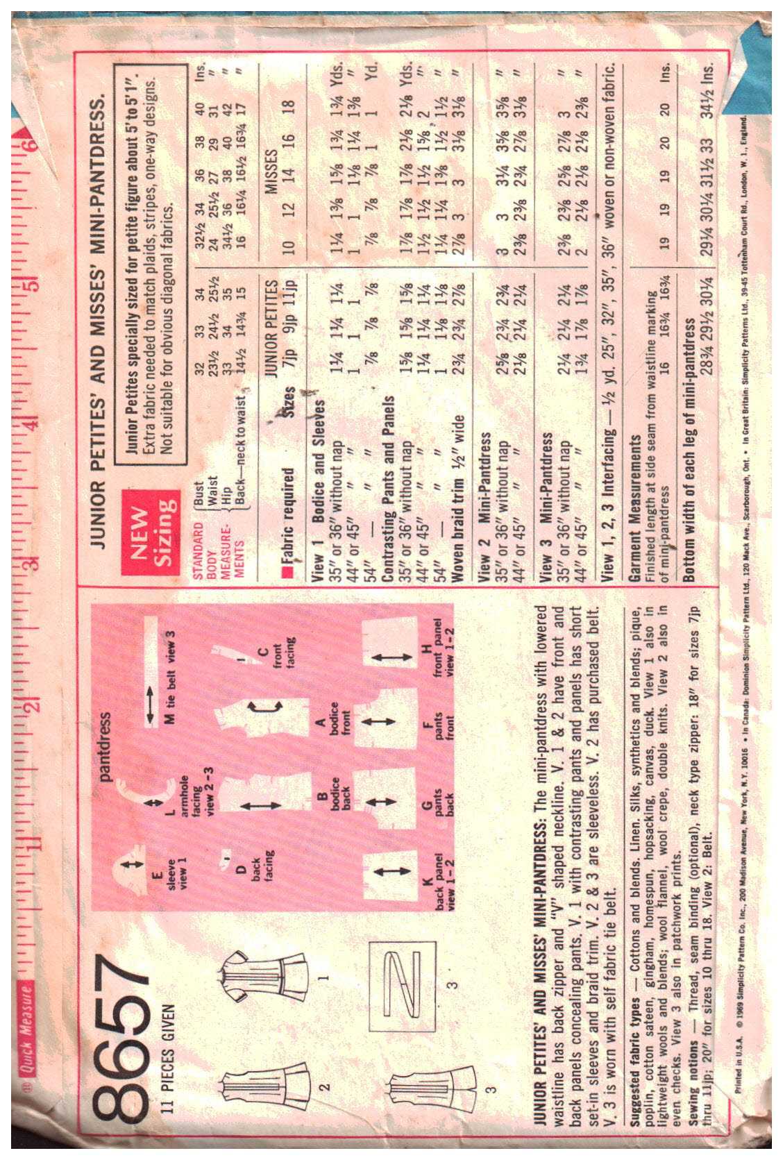 Simplicity 8657 Pant-Dress Size: 9JP Bust 33 Used Sewing Pattern