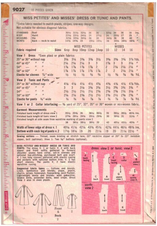 Simplicity 9027 Dress, Tunic, Pants Size: 10 Bust 32.5 Used Sewing Pattern