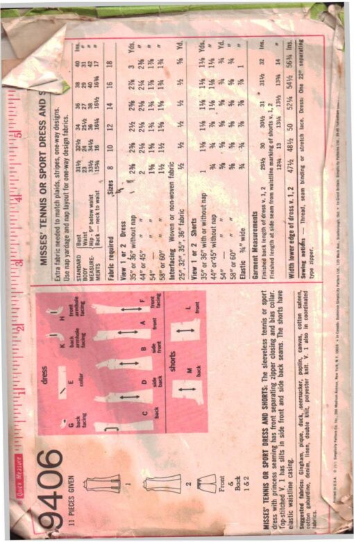 Simplicity 9406 Tennis Dress, Shorts Size: 10 Bust 32.5 Used Sewing Pattern