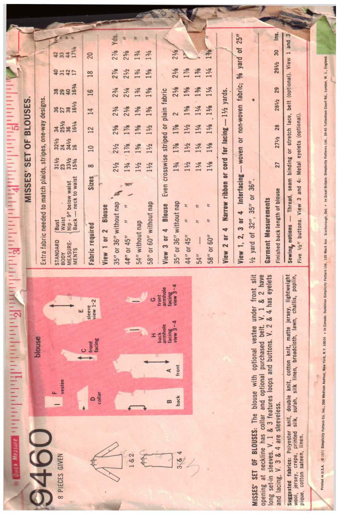 Simplicity 9460 Sewing Pattern