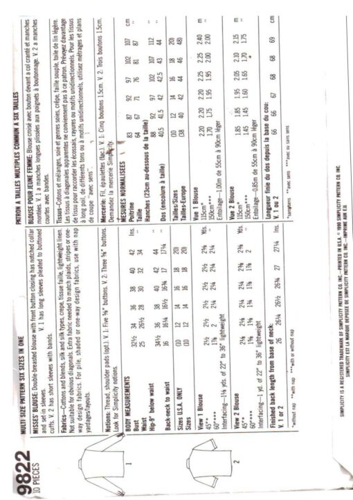 Simplicity 9822 Tops Size: 10-20 Used Sewing Pattern