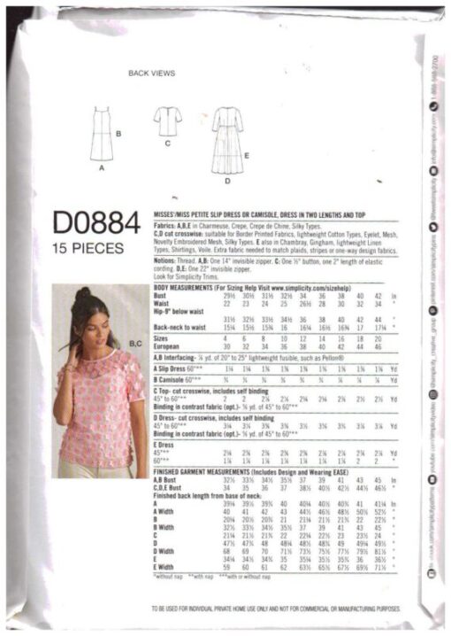Simplicity D0884 Slip Dress, Camisole, Dress, Top Size: P5 12-20 Uncut Sewing Pattern