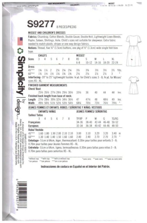 Simplicity S9277 Misses, Girls’ Dress Size: 3-8/XS-XL Uncut Sewing Pattern