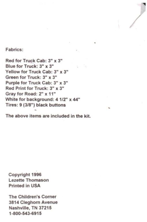 The Children’s Corner Keep on Trucking A Patchwork Inset Size: One Uncut Sewing Pattern